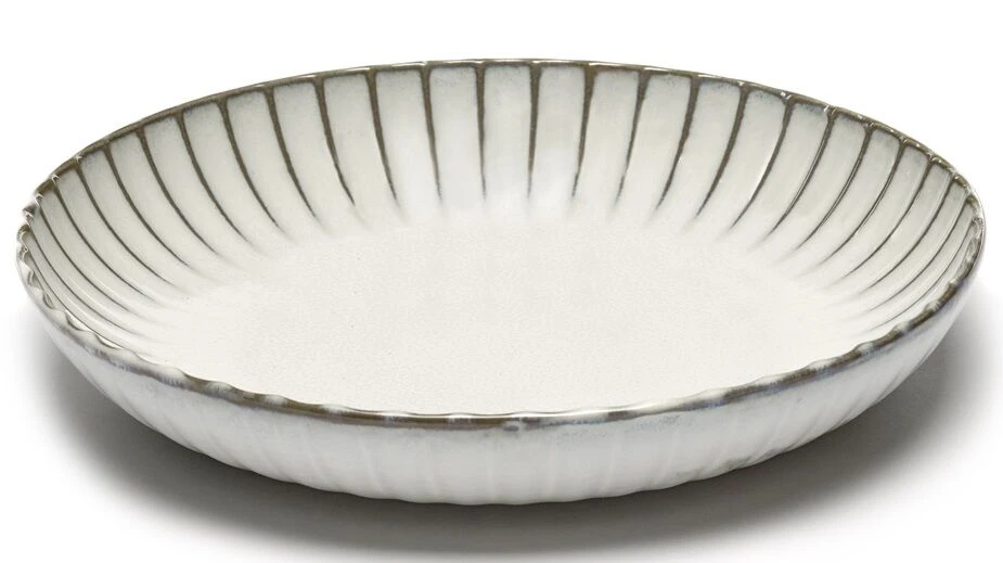 De serveerschaal S van Serax INKU heeft een diameter van 27 cm en is 5 cm hoog, en is aan de rand voorzien van een decoratief ribbelpatroon. De schaal is gemaakt van steengoed (aardewerk) en is wit geglazuurd. Gebruik voor het serveren van gerechten.