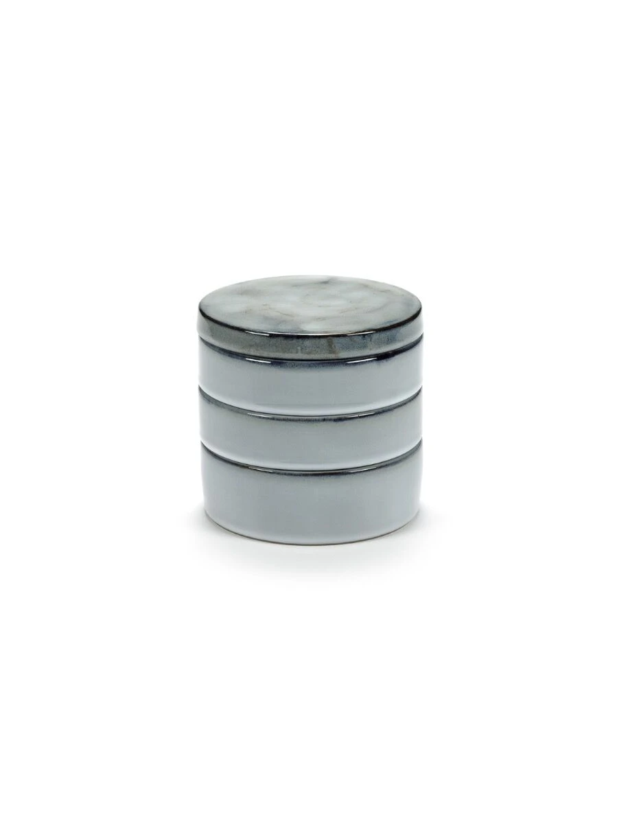 De Serax Pure kommenset is gemaakt van Blue Glazed, lichtblauw, keramiek. De kommen hebben een diameter van 14 cm, in totaal heeft de set een hoogte van 15 cm. Ontworpen door Pascale Naessens. De kommen zijn los te gebruiken of als voorraadpot te gebruiken inclusief de deksel. De set bestaat uit 3 kommen en 1 deksel.